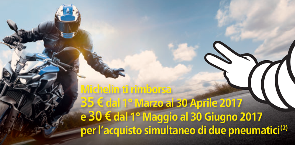 Dal 1° Marzo fino al 30 Giugno 2017 Michelin ti rimborsa, di 35 € dal 1° Marzo al 30 Aprile 2017 e 30 € dal 1° Maggio al 30 Giugno 2017, l’acquisto simultaneo di due pneumatici delle seguenti marche: